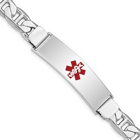 Specifications: Material: Primary - Purity:925|Finish:Polished|Length of Item:7 in|Material: Accents:Enamel|Plating:Rhodium|Material: Accent Color 1:Red|Chain Length:7 in|Chain Type:Anchor|Chain Width:9 mm|Charm/Element Length:46 mm|Charm/Element Width:13 mm|Clasp /Connector:Lobster|Manufacturing Process:Casted|Material: Primary:Sterling Silver|Engravable:Yes|Product Type:Jewelry|Jewelry Type:Bracelets|Sold By Unit:Each|Bracelet Type:Medical|Gender:Women's|Material: Primary - Color:White|Plating Color:Silver Tone