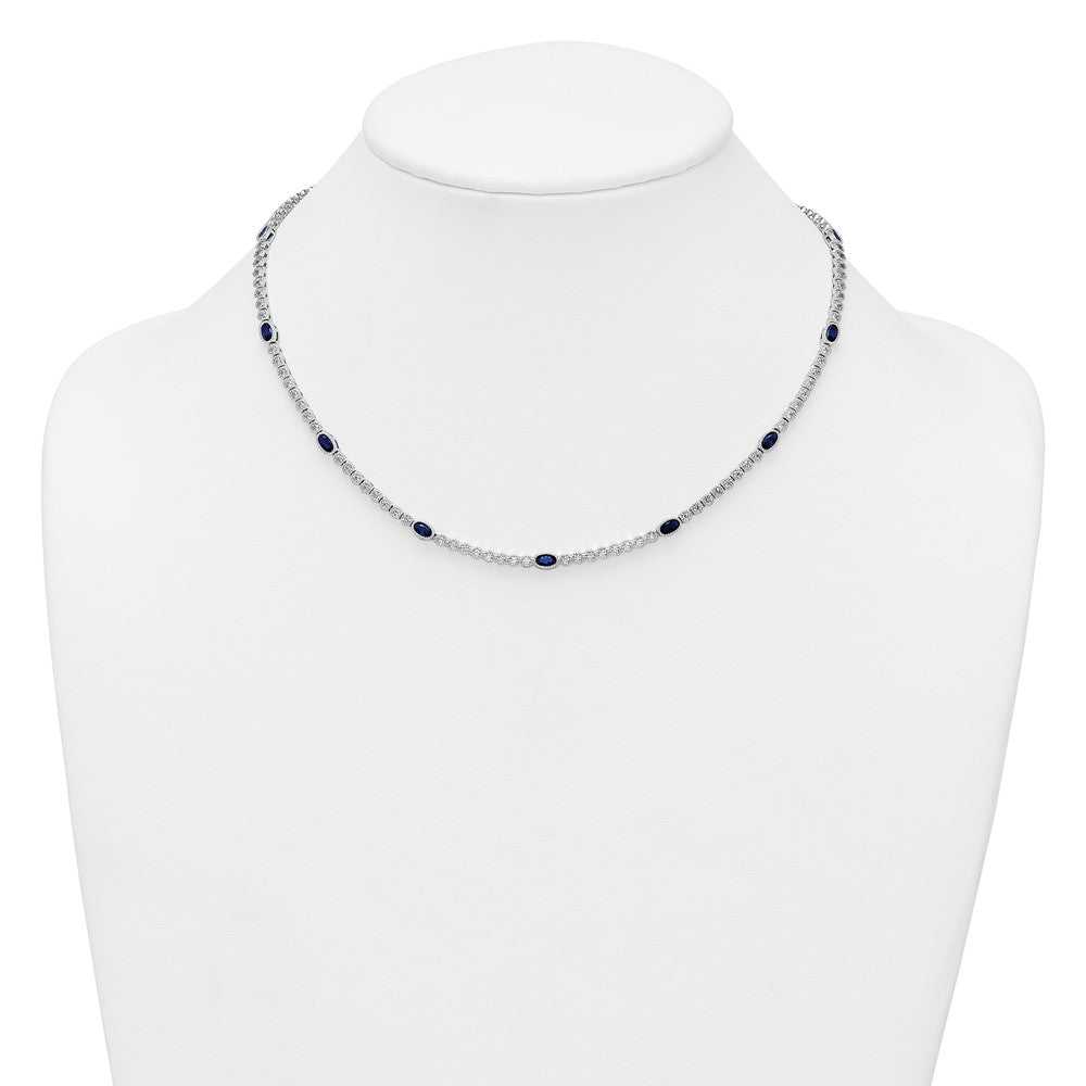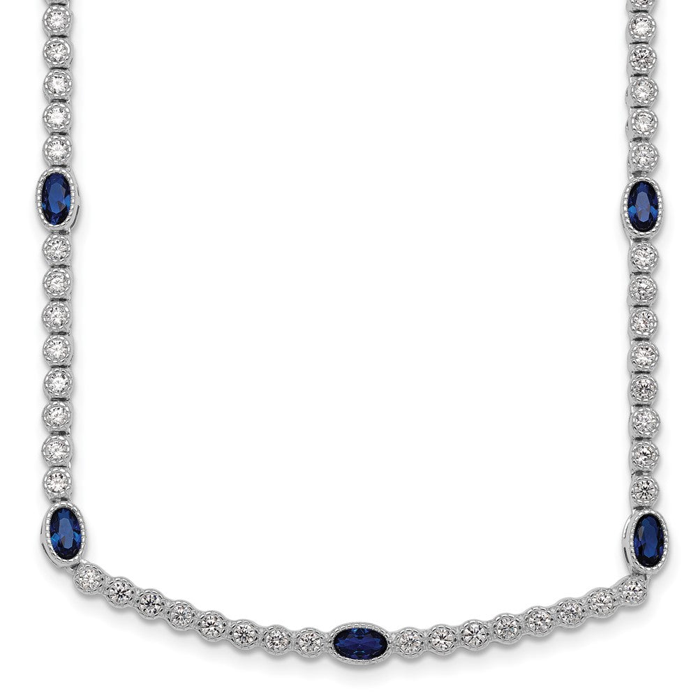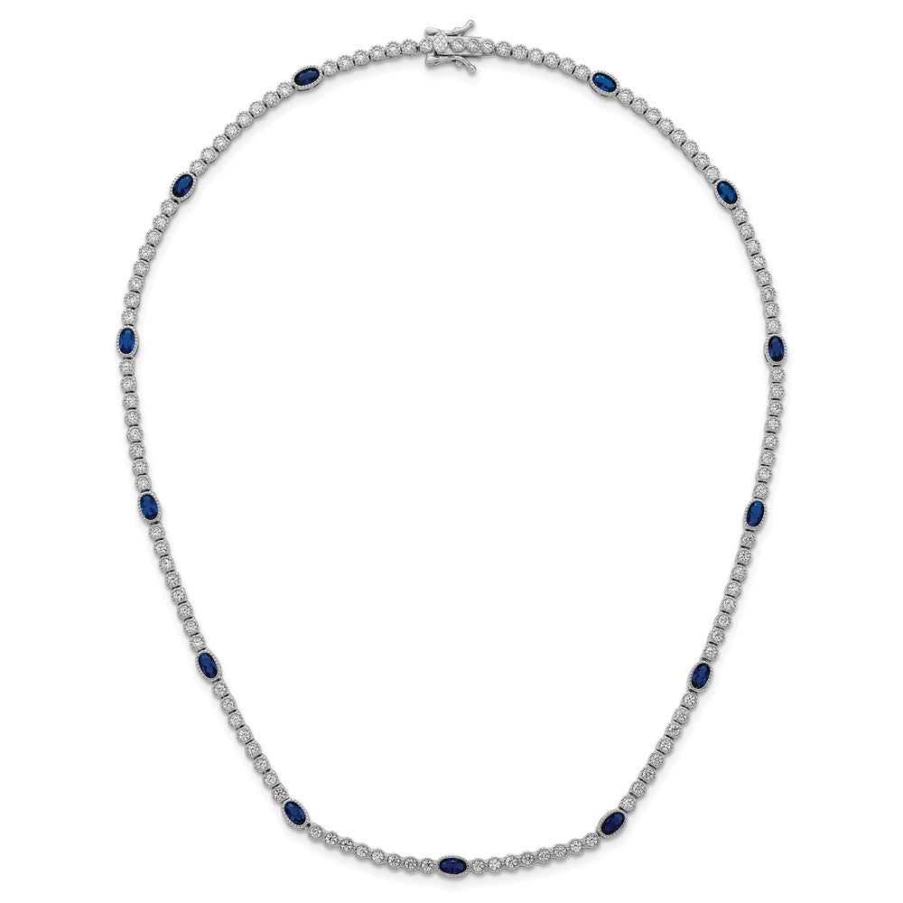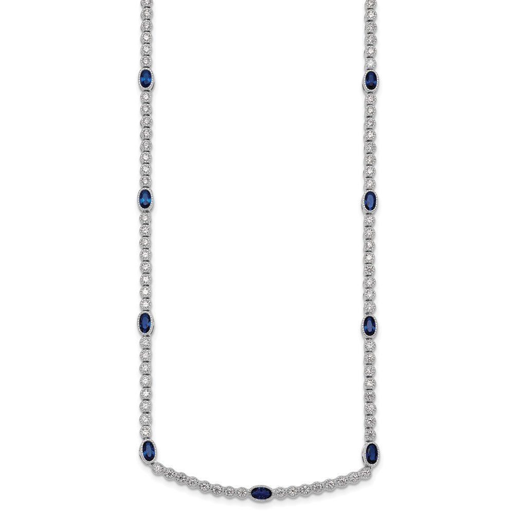 Specifications: Material: Primary - Purity:925|Finish:Polished|Stone Type_1:Cubic Zirconia (CZ)|Stone Type_2:Cubic Zirconia (CZ)|Stone Color_1:Blue|Stone Color_2:White|Stone Quantity_1:13|Length of Item:17 in|Stone Setting_1:Bezel Set|Stone Setting_2:Bezel Set|Chain Length:17 in|Clasp /Connector:Box Catch|Material: Primary:Sterling Silver|Completeness:Complete (all stones included)|Stone Shape_1:Oval|Stone Shape_2:Round|Stone Treatment_1:Synthetic|Stone Treatment_2:Synthetic|Product Type:Jewelry|Jewelry Type:Necklaces|Sold By Unit:Each|Necklace Type:Fancy Necklace|Gender:Women's|Material: Primary - Color:White|Plating Color:Silver Tone|Stone Creation Method_1:Synthetic|Stone Creation Method_2:Synthetic|Plating: Chain:Rhodium