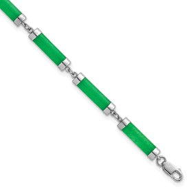 Specifications: Material: Primary - Purity:925|Finish:Polished|Stone Color_1:Green|Stone Quantity_1:9|Length of Item:8 in|Plating:Rhodium|Chain Length:7.75 in|Clasp /Connector:Lobster|Material: Primary:Sterling Silver|Completeness:Complete (all stones included)|Stone Shape_1:Barrel|Width of Item:4.15 mm|Product Type:Jewelry|Jewelry Type:Bracelets|Sold By Unit:Each|Bracelet Type:Gemstones|Material: Primary - Color:White|Number of Elements:9|Plating Color:Silver Tone|Stone Creation Method_1:Natural|Stone Type (Other)_1:Jade