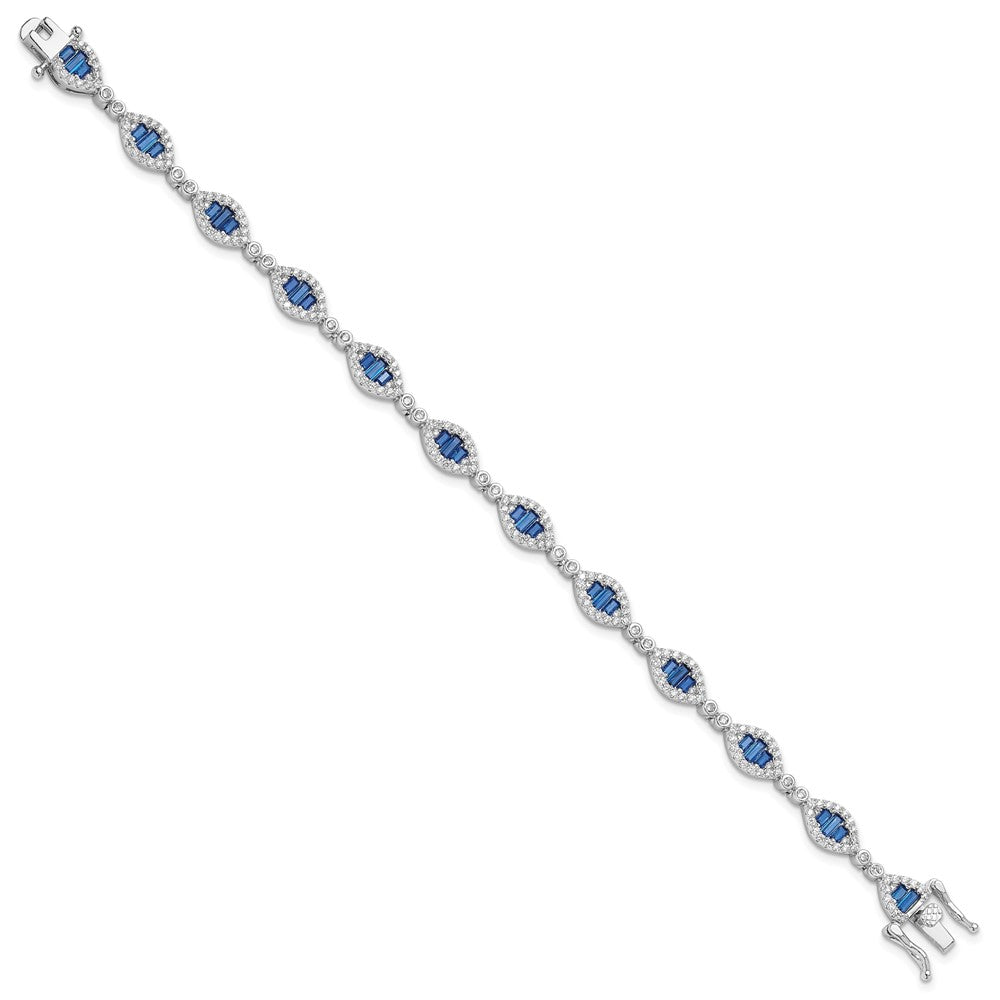 Specifications: Material: Primary - Purity:925|Finish:Polished|Stone Type_1:Cubic Zirconia (CZ)|Stone Type_2:Cubic Zirconia (CZ)|Stone Color_1:White|Stone Color_2:Blue|Stone Quantity_1:216|Stone Quantity_2:35|Length of Item:8 in|Plating:Rhodium|Chain Length:7 in|Chain Type:Fancy|Chain Width:6.45 mm|Clasp /Connector:Box Catch|Extender Length:1 in|Feature:Solid|Material: Primary:Sterling Silver|Completeness:Complete (all stones included)|Stone Shape_1:Round|Stone Treatment_1:Synthetic|Stone Treatment_2:Synthetic|Width of Item:5.25 mm|Product Type:Jewelry|Jewelry Type:Bracelets|Sold By Unit:Each|Bracelet Type:CZ Bracelets|Material: Primary - Color:White|Plating Color:Silver Tone|Stone Creation Method_1:Synthetic|Stone Creation Method_2:Synthetic