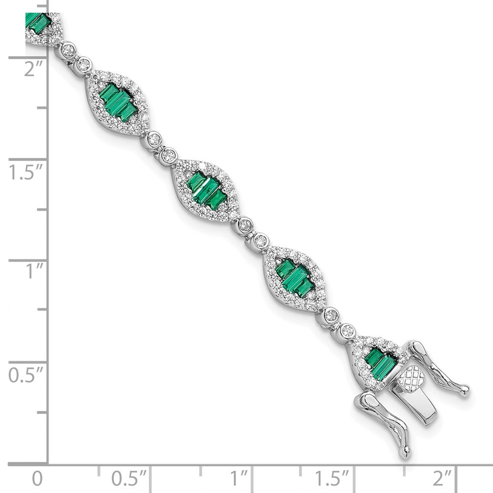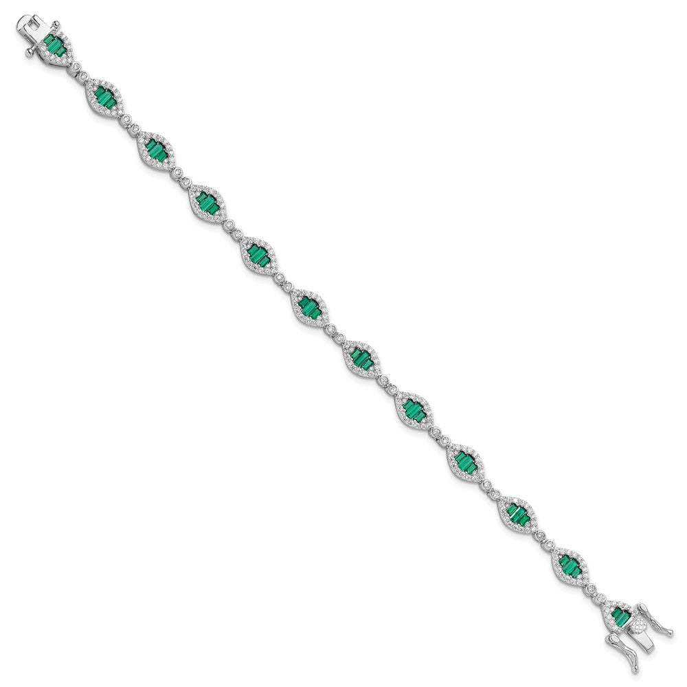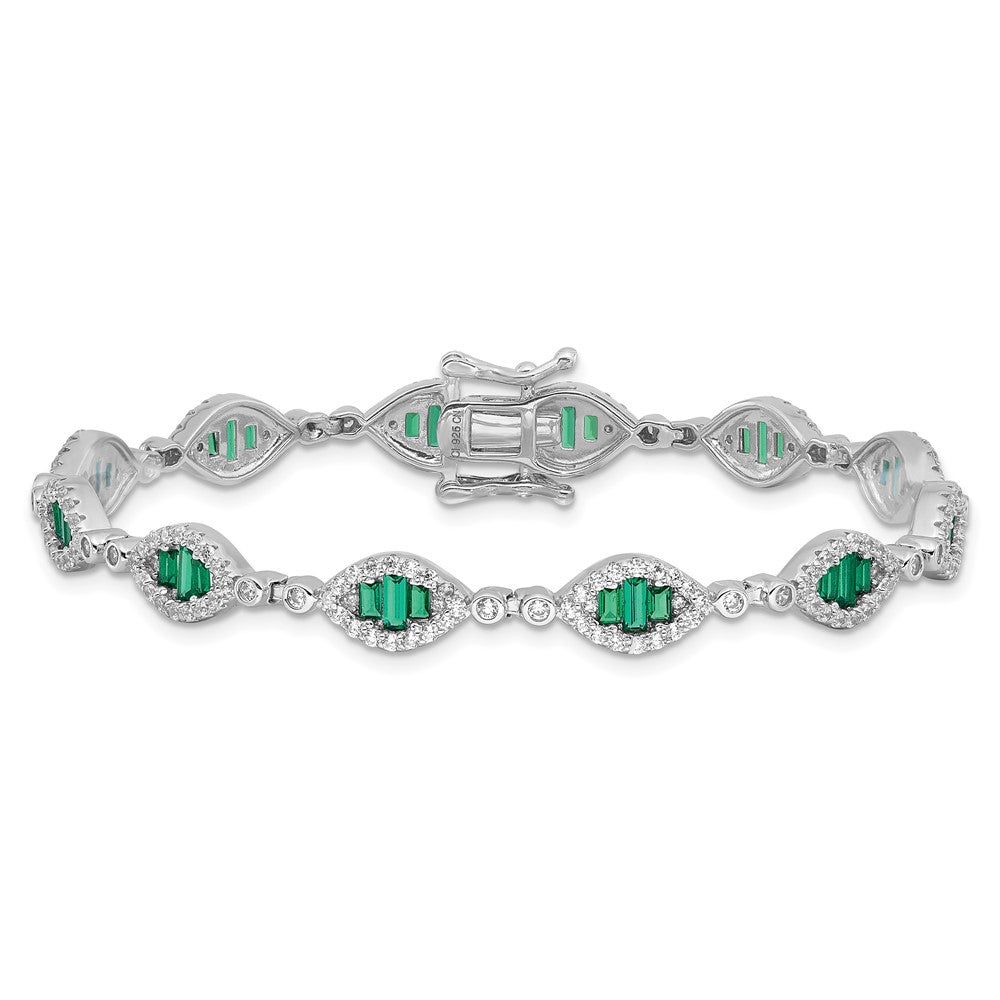 Specifications: Material: Primary - Purity:925|Finish:Polished|Stone Type_1:Cubic Zirconia (CZ)|Stone Type_2:Cubic Zirconia (CZ)|Stone Color_1:White|Stone Color_2:Green|Stone Quantity_1:216|Stone Quantity_2:35|Length of Item:8 in|Plating:Rhodium|Chain Length:7 in|Chain Type:Fancy|Chain Width:6.45 mm|Clasp /Connector:Box Catch|Extender Length:1 in|Feature:Solid|Material: Primary:Sterling Silver|Completeness:Complete (all stones included)|Stone Shape_1:Round|Stone Treatment_1:Synthetic|Stone Treatment_2:Synthetic|Width of Item:5.25 mm|Product Type:Jewelry|Jewelry Type:Bracelets|Sold By Unit:Each|Bracelet Type:CZ Bracelets|Material: Primary - Color:White|Plating Color:Silver Tone|Stone Creation Method_1:Synthetic|Stone Creation Method_2:Synthetic