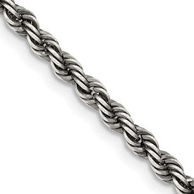 Specifications: Material: Primary - Purity:925|Finish:Antiqued|Length of Item:24 in|Plating:Ruthenium|Chain Length:24 in|Chain Type:Rope|Chain Width:3.4 mm|Clasp /Connector:Lobster|Feature:Solid|Manufacturing Process:Casted|Material: Primary:Sterling Silver|Width of Item:3.4 mm|Product Type:Jewelry|Jewelry Type:Necklaces|Sold By Unit:Each|Necklace Type:Chain Styles|Gender:Unisex|Material: Primary - Color:White|Plating Color:Black|Plating: Chain:Ruthenium